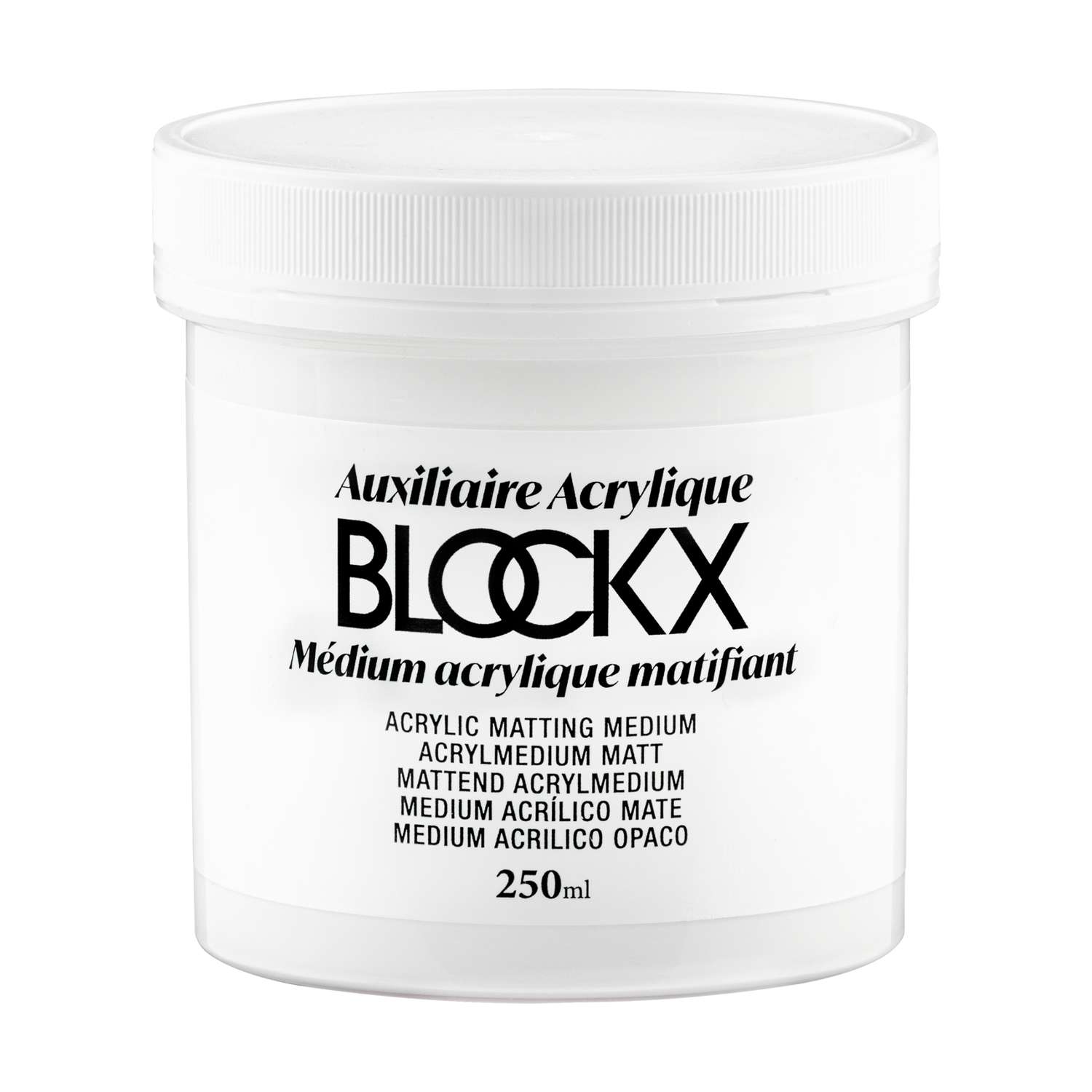 BLOCKX Acrylic Matt medium is essentially acrylic paint without pigment, appearing white in the bottle but drying to a clear, non-reflective finish.