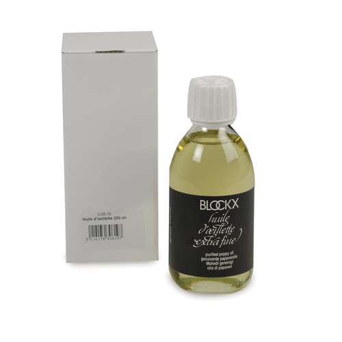 Poppy oil is less yellowing, but also less drying, than linseed oil. It is recommended for use with light colours e.g. whites, light tones and blues.