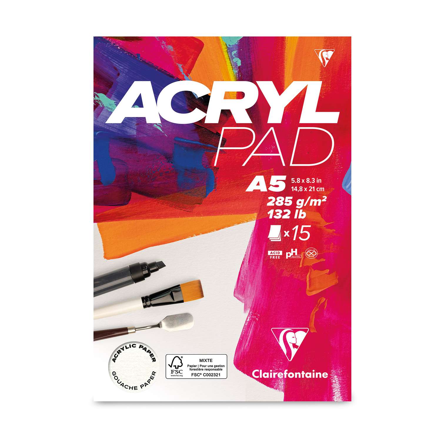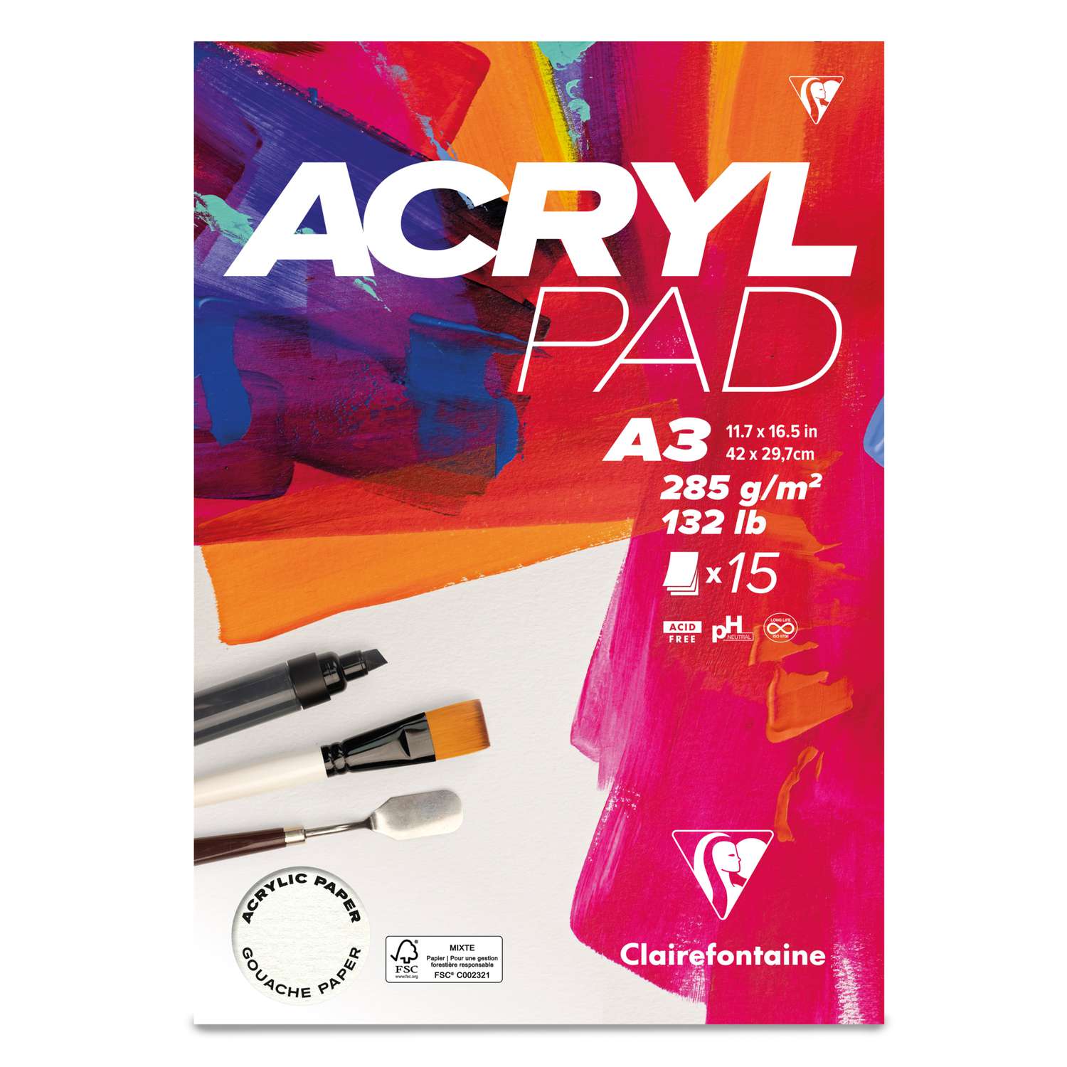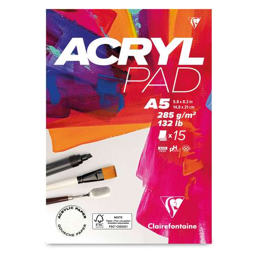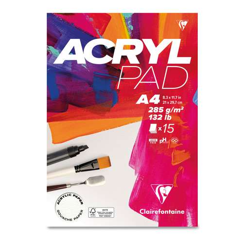 Clairefontaine ACRYL PADS contain 15 sheets (10 sheets for the 50 cm x 65 cm pad) of natural white acrylic paper with a very light grain. The paper is designed for acrylic paint but is also suitable for gouache.