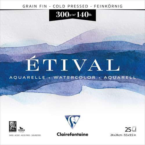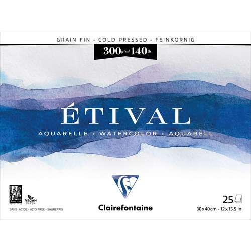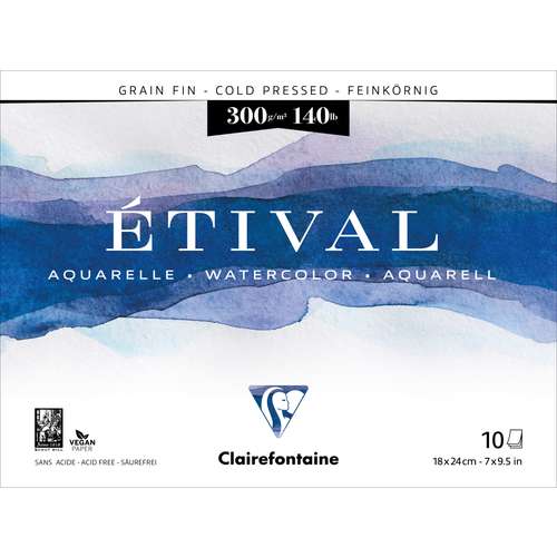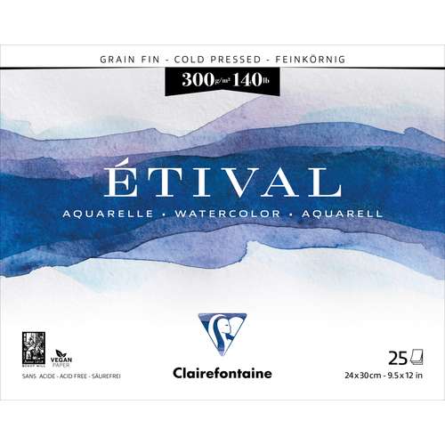 Clairefontaine ETIVAL watercolour blocks contain cold pressed, natural white, 300 gsm paper. The paper is made from 100% pure cellulose and has almost identical qualities to paper made from 100% rag.