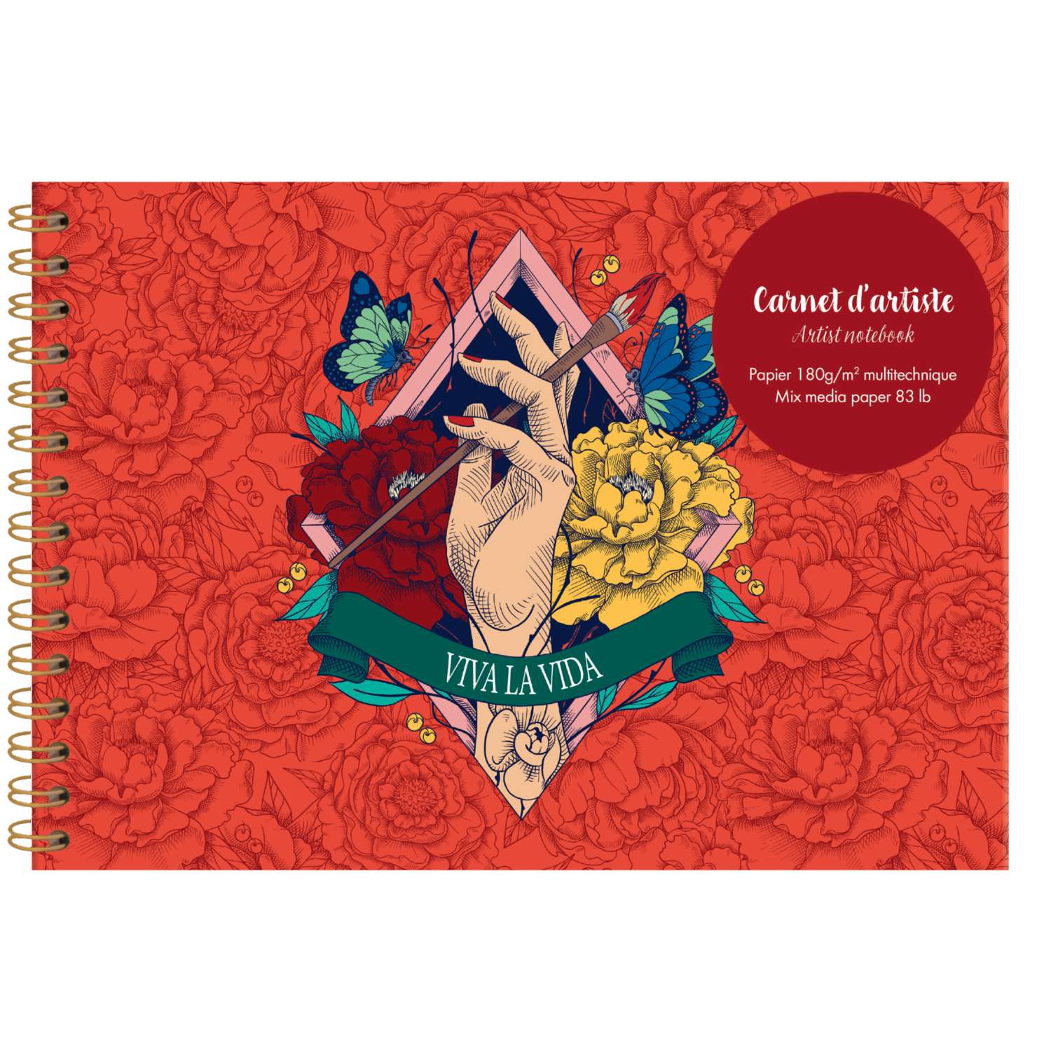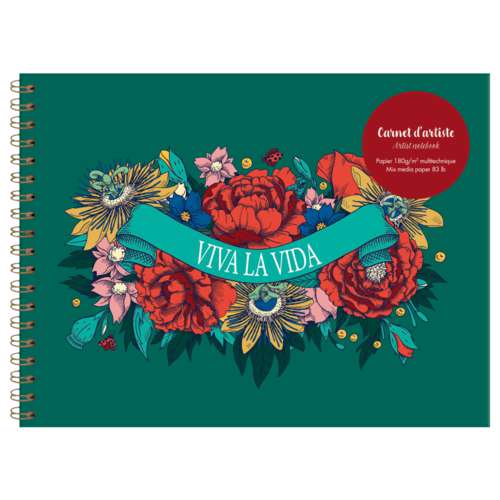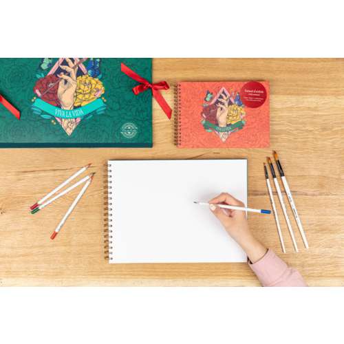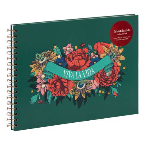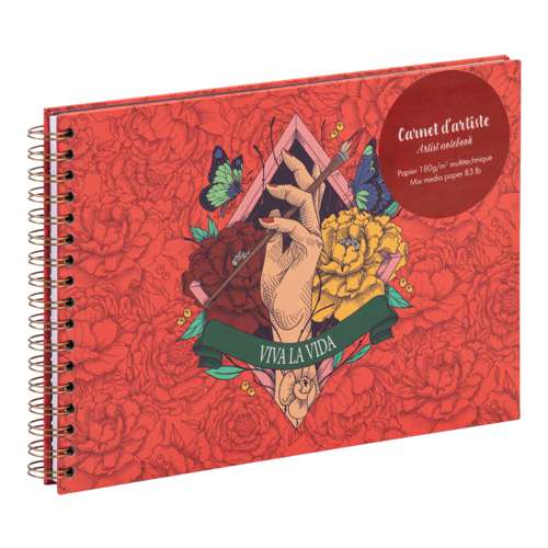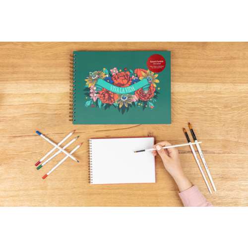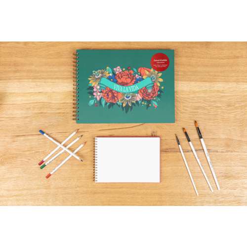 The artists notebooks are landscape format and have spiral bindings . They contain high-quality plain white 180 gsm paper, with a satin finish, ideal for mixed media techniques. Thanks to the spiral binding, the pages can be turned comfortably and opened completely, making working with them particularly pleasant. A printed quote from Frida Kahlo – ‘I paint flowers so they don't die’ – gives the notebooks additional artistic expression.