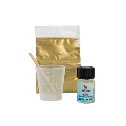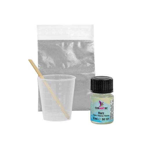 These CREARTEC ARTIDEE® Resin Tints are available in 10 ml bottles (item code 49455). The metallic colours silver, gold and copper (item code 49471) are supplied in powder form, together with an 8 ml bottle of resin, a mixing cup and a stirring rod.