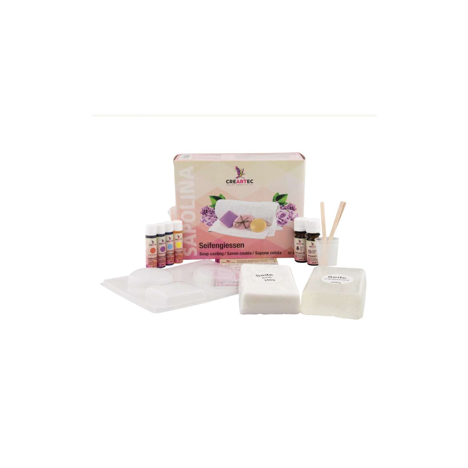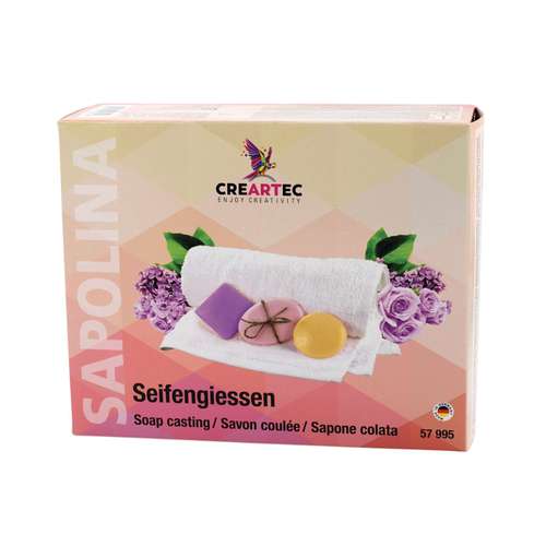 The Creartec SAPOLINA Soapmaking set is a versatile soap moulding set containing glycerine soap in white and transparent. It also includes the necessary accessories.