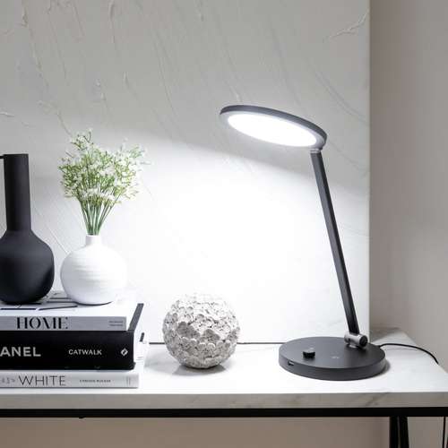 In light therapy mode, the daylight™ TriSun SAD & Desk lamp delivers 10,000 lux at 16 cm, with automatic shut-off after 30 minutes for optimal comfort. The light intensity can be easily adjusted via a dimmer switch, and a built-in USB port allows you to charge your devices.