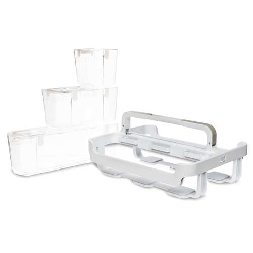 This organiser consists of a white carrying frame containing three separate, transparent storage trays — one small, one medium and one large. The frame’s handle doubles as a holder for an additional carrying frame that you place on top and click into place using two clips integrated into the handle — allowing you to build a tower of carrying frames with storage trays.