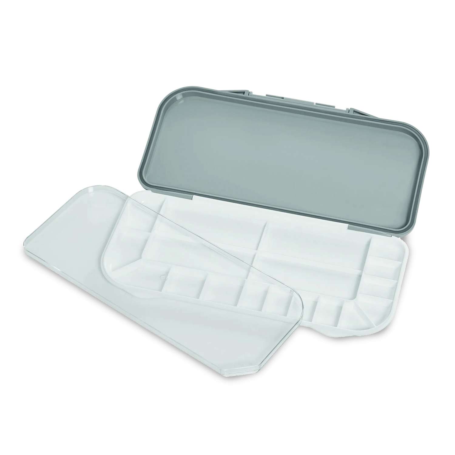 The deflecto® Paint Saver is a palette, paint saver and mixing tray in one! It measures 12.7 x 27.1 x 2.6 cm and features 18 compartments to organise your paints, plus a bonus clear mixing tray that fits inside the lid.