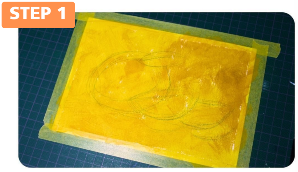 After you have chosen the paper and size you want to get started with, it’s time to glue on the paper. I stuck the paper on with a masking tape that has as little glue in it as possible so that when you remove it you don’t damage your paper. As a background for the painting, I used an acrylic paint thinned with water. I chose a yellow colour to match the end result I had in mind. Acrylic is permanent after drying unlike gouache and is therefore better suited as an undercoat.