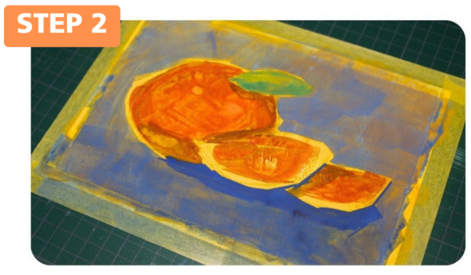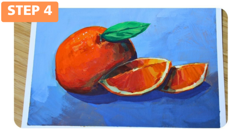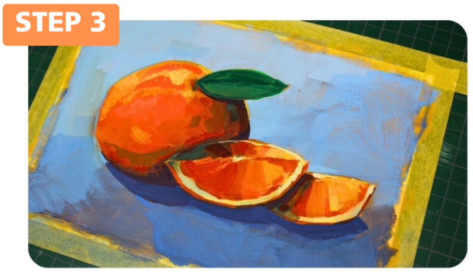 In the first layer I always try to make sure that it is clear to myself where I want each colour to be and where any shadows are. As you can see, in this layer I divided my composition into areas of colour and filled them in with the gouache. I gave the shadows, which are on and under the pieces of the orange, a cooler shade. I use my large brushes in this layer because in this layer you don’t work on the details yet. That comes later.