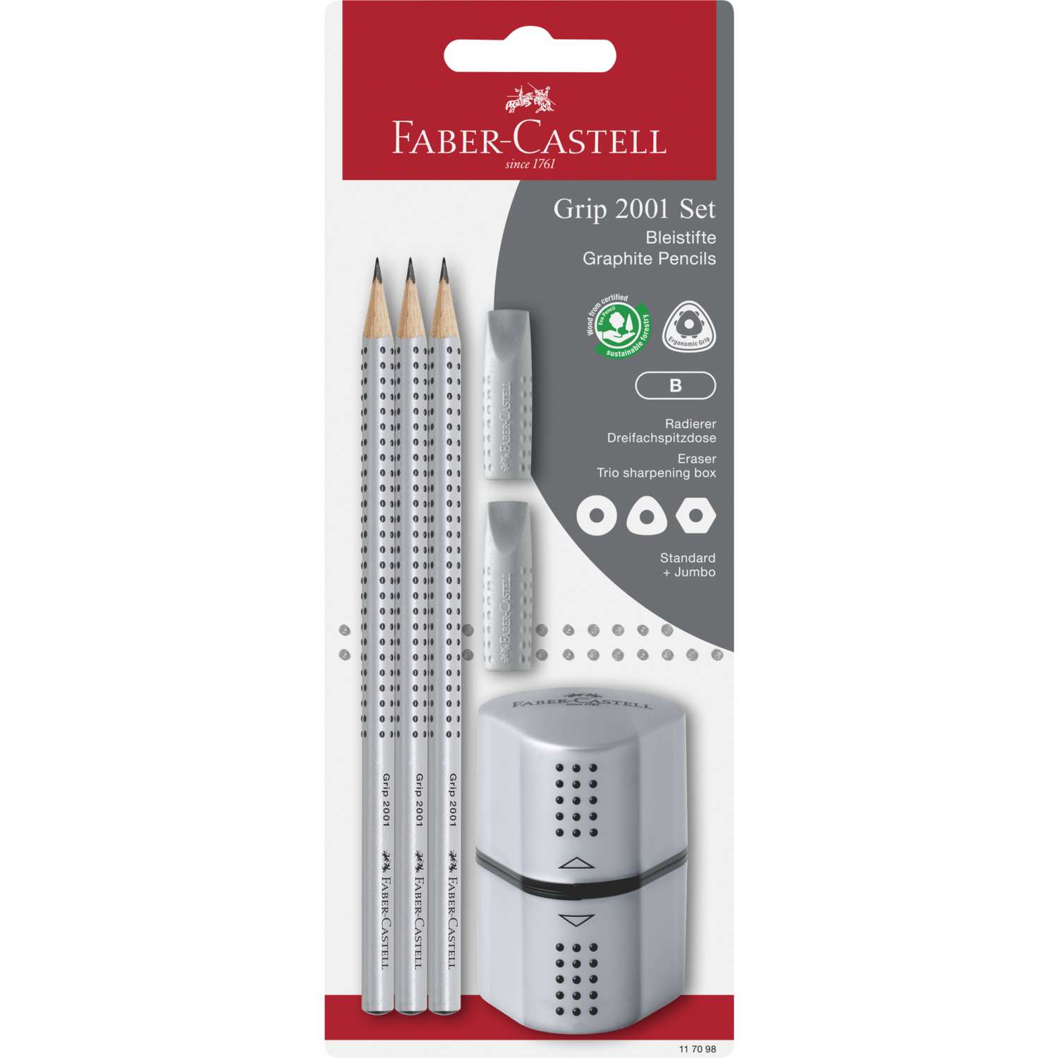 This FABER-CASTELL Grip 2001 Set is a 6 piece set containing 3 ergonomic HB pencils - perfect for sketching, drawing and writing, 2 eraser caps and a 3 hole sharpener.