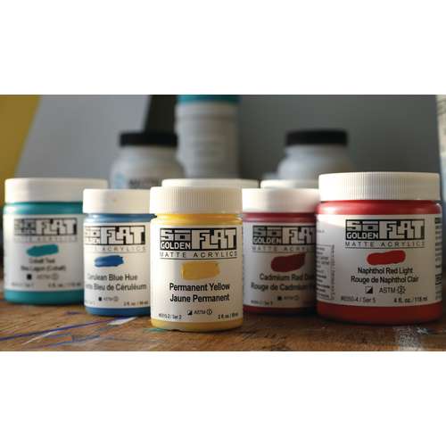 GOLDEN® SoFLAT™ MATTE ACRYLICS have been specially formulated to achieve uniform surfaces with rich, matt colours in fewer layers than with most other acrylic paints. They offer high quality and consistency.
