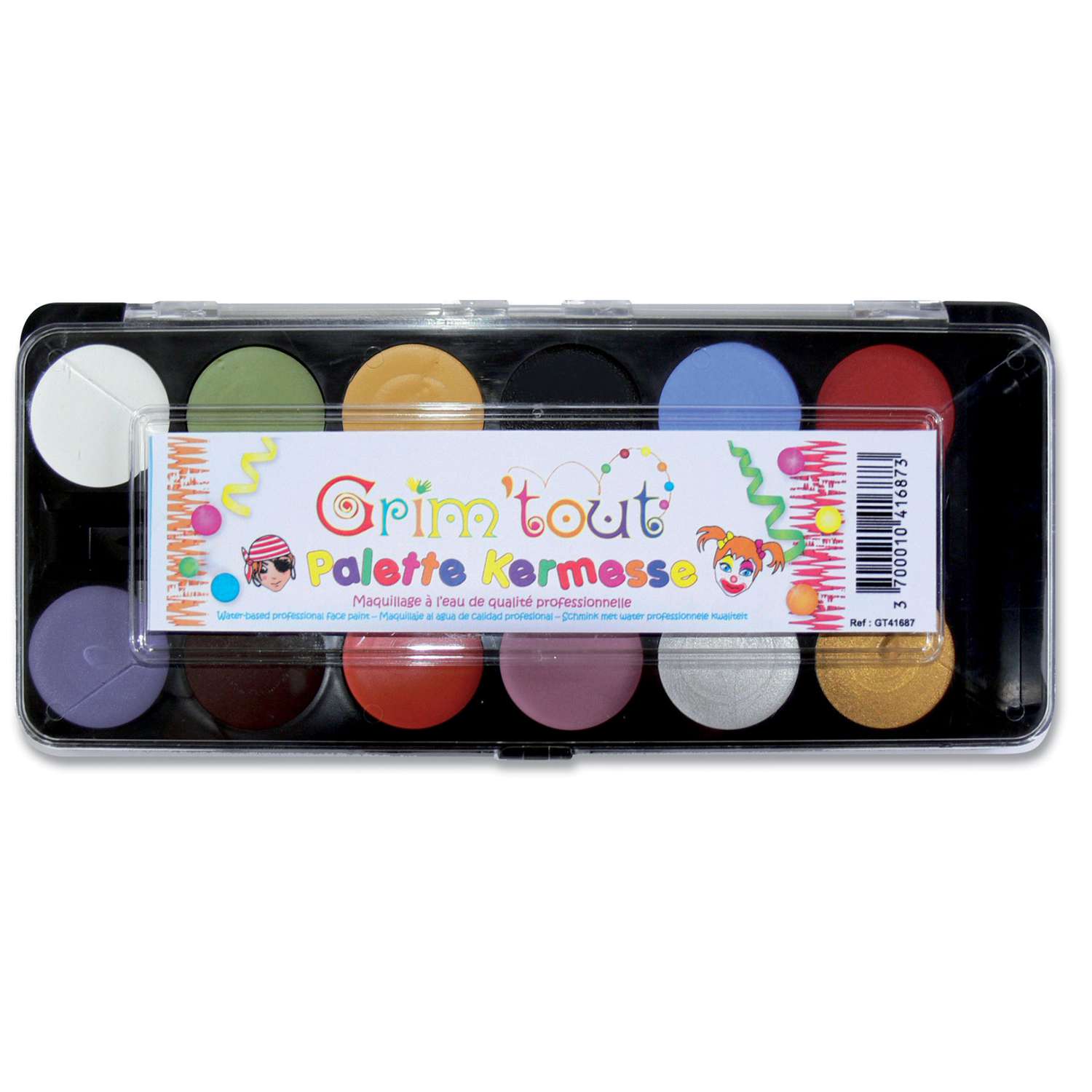 This Grim'tout Child's Make-Up Palette contains 12 make-up colours and a make-up brush. The colours have been developed specially for children's skin and can be applied quickly and easily.