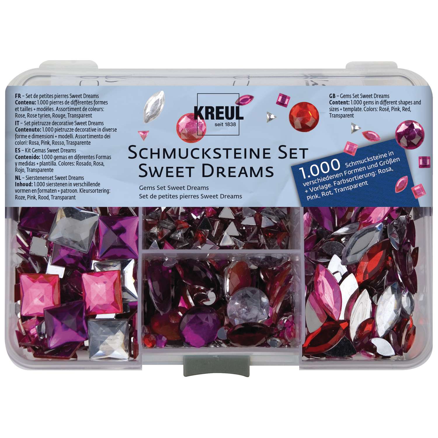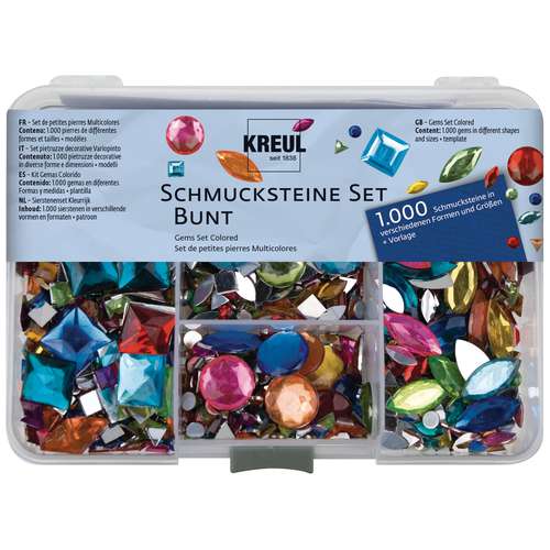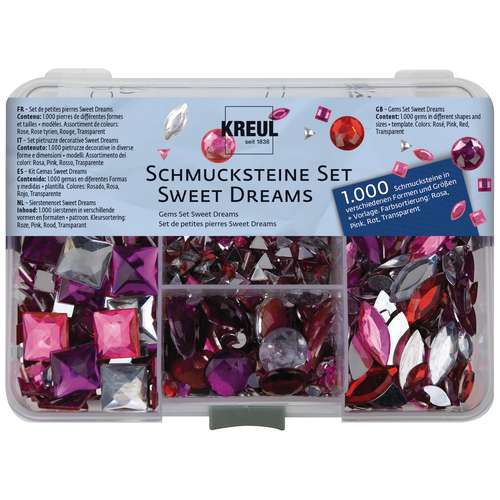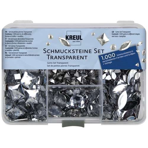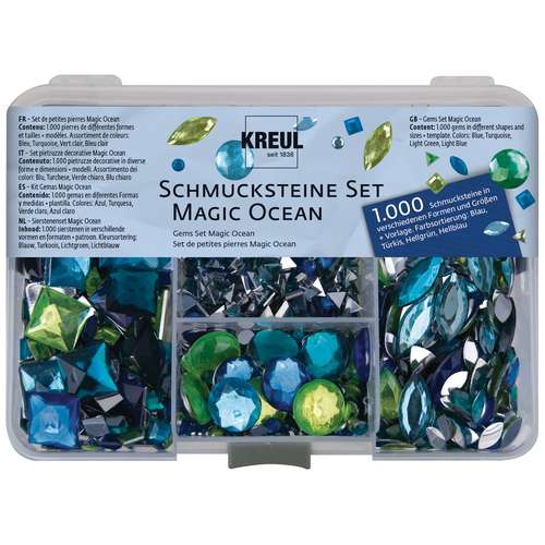 These sets are available in various themes - transparent, multicoloured, dreams (pink shades), and ocean (blue and green shades). Each set is in a resealable plastic box with space for a gemstone glue bottle.