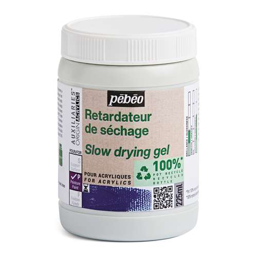 With this medium you can slow down the drying time of acrylic colours by about 50%. This keeps your paint open longer. Vegetable-based. Creamy texture. Suitable for all types of acrylic colours.
