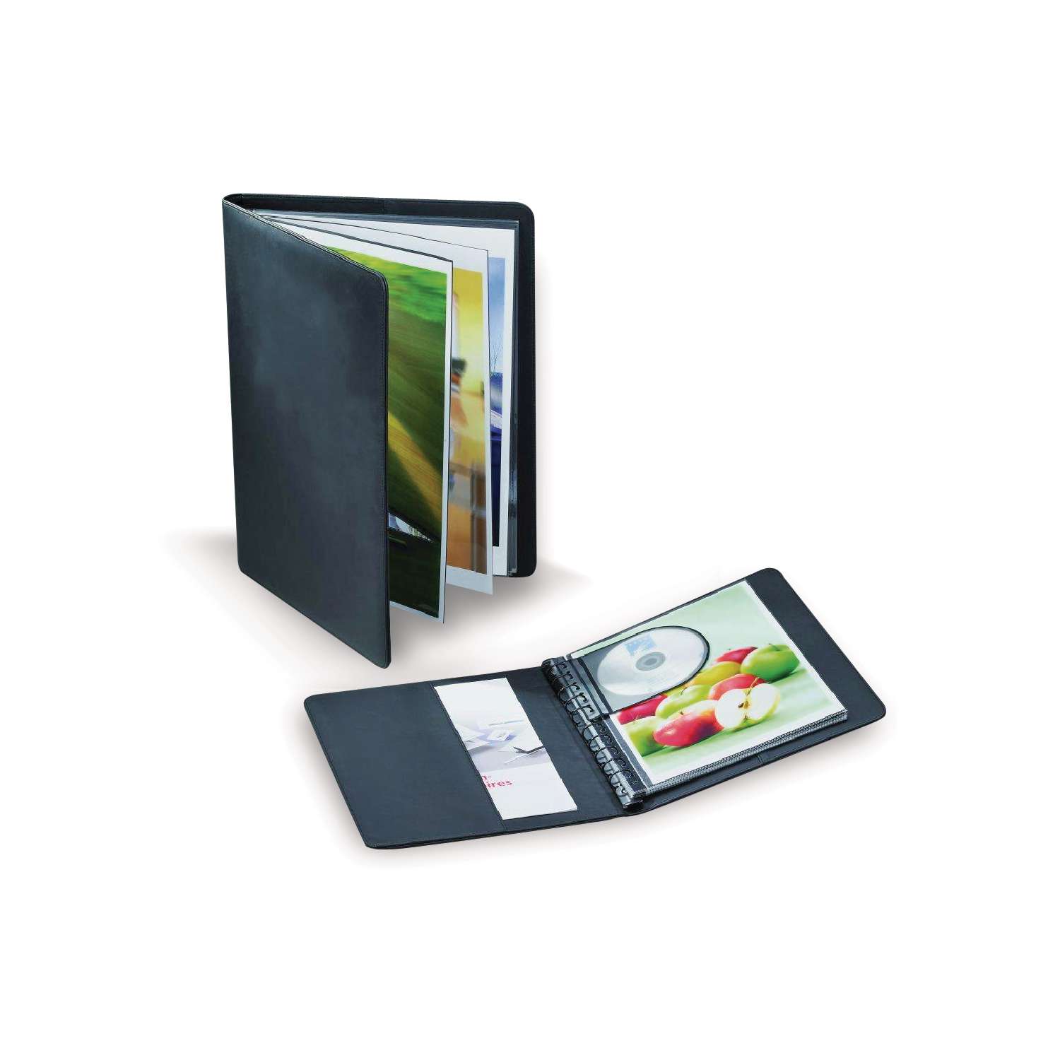 These fine black synthetic leather presentation folders contain 10 clear sleeves with black paper inserts, and have 2 pockets and a CD/DVD compartment. They have a practical multi-ring mechanism.