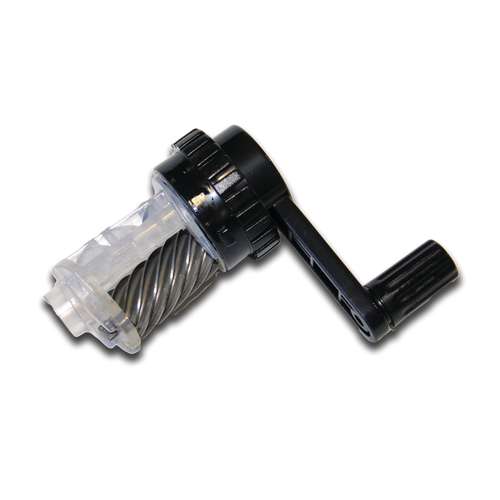 This sturdy table sharpener has a black plastic housing and a transparent waste container. The crank handle enables easy sharpening.